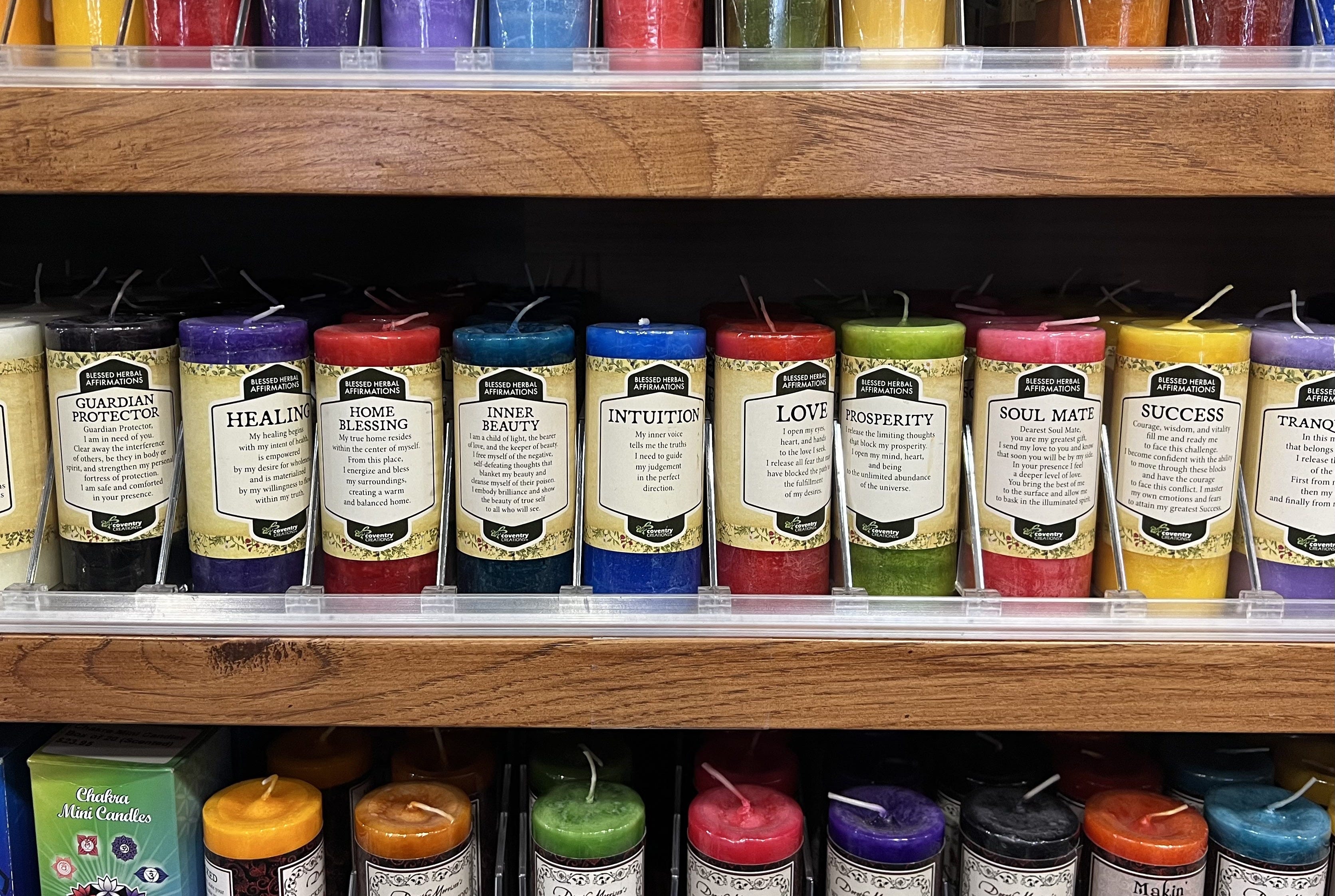 Every prayer candle at the spiritual store in the Village was fully stocked except INTUITION, which had only one left.