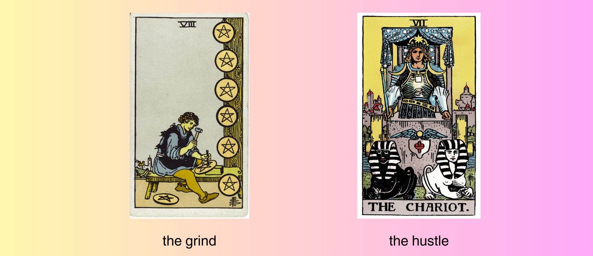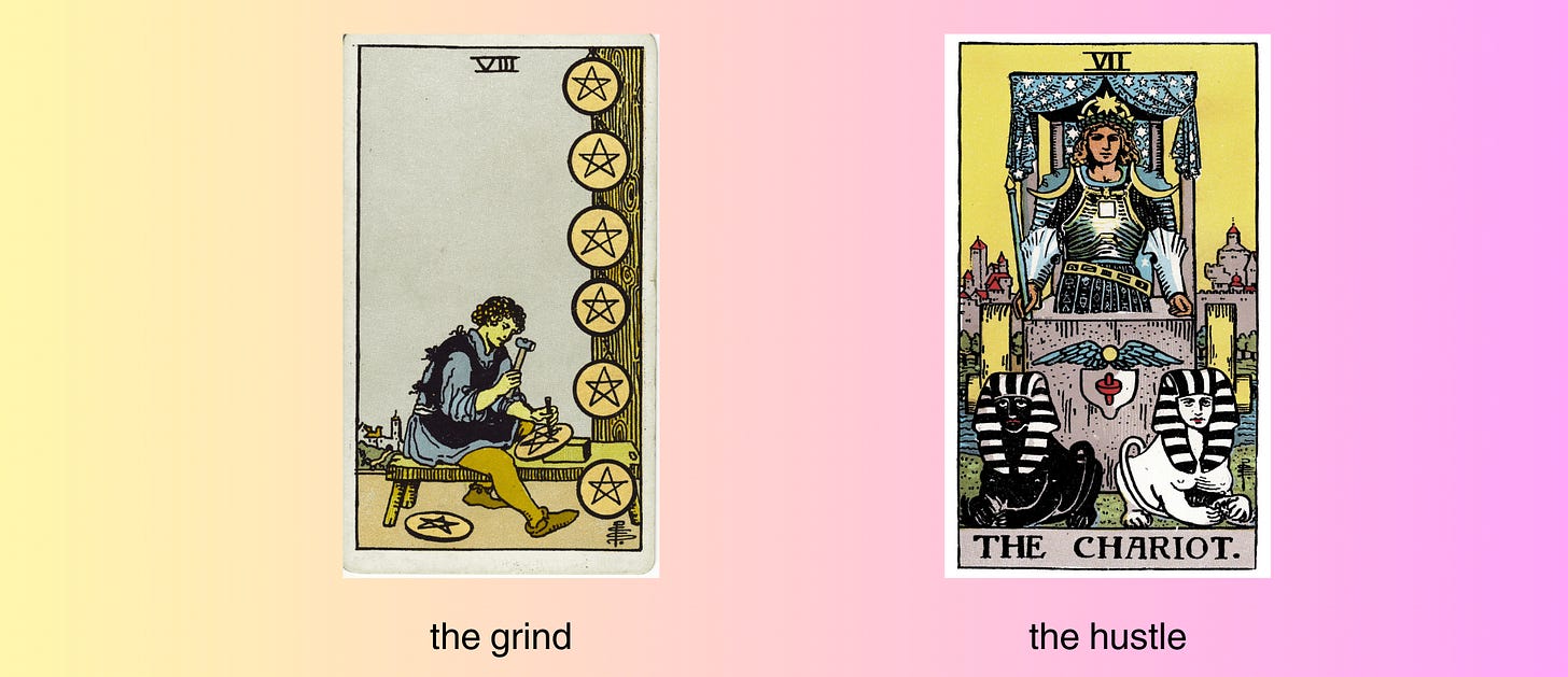 Hustler energy is different. It’s the forward momentum of The Chariot, with the established past in your rearview. The hustle is the kind of work that requires you to stay flexible and open, to keep moving. Usually, it requires a bit of a fire under your ass in the way of financial or personal pressure. Where the grind is an appointment, the hustle feels more like a quest.